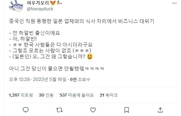 한,중,일 세나라 사람이 모인 식사자리에서 일어난 일 작성자 정보 꼬돌이 작성 작성일 2023.05.16 14:29 컨텐츠 정보 698 조회 목록 관리 글수정 글삭제 답글 본문 근데 요즘애들은 하얼빈 알까? ㅋㅋㅋㅋ 그딴거 몰라도 되요! 할거 같아서 두려워진다. 관련자료 이전 수원역 폭행 살인사건 가해자들 작성일 2023.05.16 14:32 다음 코코아를 사러간 두 딸과 엔지니어 아빠 작성일 2023.05.16 14:25 댓글 0 등록된 댓글이 없습니다. Select File Upload File 목록 관리 글수정 글삭제 답글